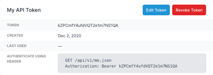 We use (Bearer) token-based authentication for all our API routes. You can provision an API token within our "API tokens" area. Access this section via the menu dropdown. Once you give your new token a name, it will be presented to you: